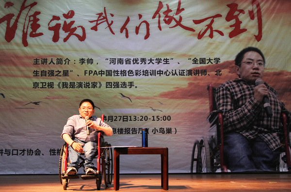 在现场师生的热烈期盼中,身患成骨不全症的“钢铁侠”李帅坐着轮椅登上舞台,自信满满地向全场观众宣示了“谁说我们做不到”的演讲主题。“我至今大概骨折过一百多次”,患有先天性成骨不全症的李帅,在生活中不能像普通人一样活动自如,但他勇于面对身体缺陷,用自己的努力和坚持创造了一个又一个的生命奇迹。他毫不避讳地告诉大家自己是个“玻璃男孩”,尽管生活在和别人不一样的世界里,可他深信“只要努力,没有什么做不到”。