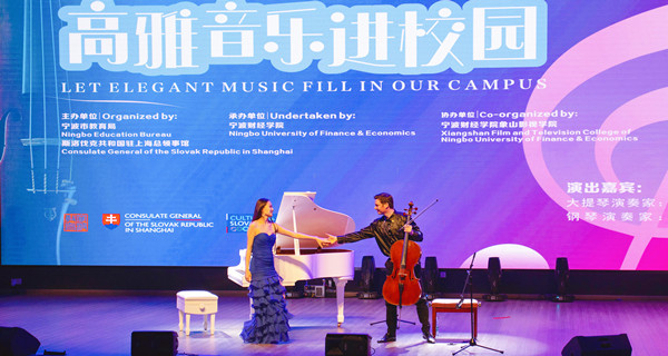 6月6日,由宁波市教育局和斯洛伐克共和国驻上海总领事馆联合主办的“高雅音乐进校园”主题音乐会走进我校象山校区,斯洛伐克共和国驻沪总领事馆总领事伊万娜·瓦拉·马加托娃、斯洛伐克共和国驻沪总领事馆商务领事雅罗斯拉夫·瓦拉、校长王云儿、校工会主席高振强出席活动。我校象山影视学院、国际合作处、校团委有关负责人,各二级学院师生代表等在象山校区实验剧场欣赏了演出。