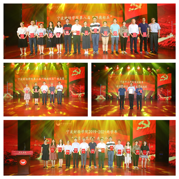 近年来,我校党员师生认真学习贯彻习近平新时代中国特色社会主义思想,深入开展党史学习教育,围绕立德树人根本任务,立足本职岗位,积极贡献,涌现出一大批在全国、全省、全市和全校范围内具有广泛影响力的先进典型。活动特意组织了颁奖仪式,对他们进行了表彰。与会领导先后为全国无偿献血促进奖特别奖获得者、浙江省第一届高校教师教学创新大赛获奖者、市教育局“两优一先”评选活动获奖者、2020年度宁波市高校思想政治工作系列评选活动获奖者、宁波市教育系统党史宣讲活动暨微型党课比赛获奖选手、2021年宁波市大学生篮球联赛体育道德风尚奖获奖球队及教练、学校第八届“师德标兵”评选活动获得者和学校2019-2021两学年“党员示范岗”先进个人颁发了荣誉证书、奖牌。