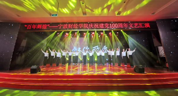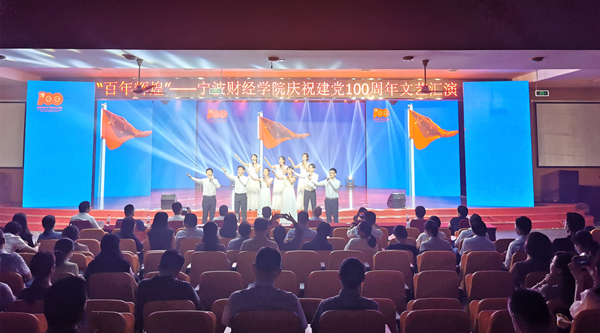 文艺汇演在快闪《唱支山歌给党听》中拉开帷幕。整场汇演精彩纷呈、高潮迭起,融艺术性、思想性、政治性于一体。飞翔合唱团演唱了激情澎湃的革命歌曲《保卫黄河》,展现了中华儿女意气风发、斗志昂扬的精神面貌。董彬彬老师、朱泽丹同学联袂演奏《红梅随想曲》,让观众们感受了“红岩上红梅开,千里冰霜脚下踩,三九严寒何所惧,一片丹心向阳开”的意境。千言话剧团深情演出原创情景剧《四明幽兰》,生动描画被誉为宁波籍江姐式英雄冯和兰烈士的光辉形象。星空舞蹈团表演舞蹈《红色摇篮》,用艺术形式和表演手段,回顾我们党的奋斗历程。菁英主持团朗诵诗歌《这盛世如你所愿》,寄托了对我们党优秀党员的无限怀念。陈耀威、陈斯老师携飞翔合唱团演唱歌曲《不忘初心》,讴歌了共产党好、社会主义好、改革开放好、伟大祖国好的主旋律,表达了宁财人不忘初心、牢记使命,永远跟党走的决心。文艺汇演结束,全场起立高唱《没有共产党就没有新中国》,将现场气氛推向最高潮,热烈的掌声经久不息。