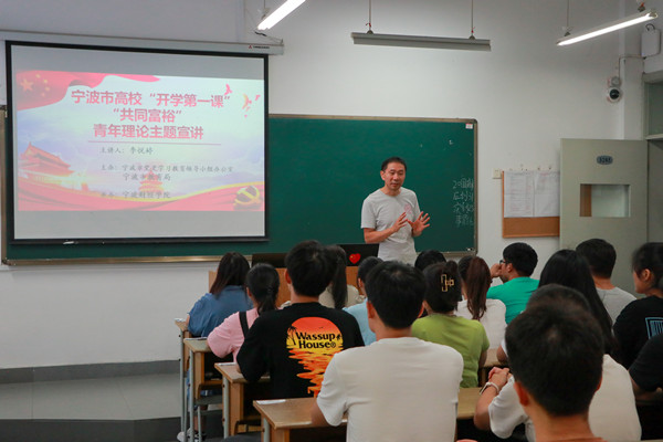 9月23日,由宁波市党史学习教育领导小组办公室、市教育局联合主办的宁波市高校“开学第一课”“共同富裕”青年理论主题宣讲活动在我校杭州湾校区举行。