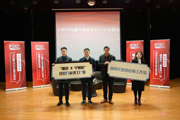为深入学习宣传党的十九届六中全会精神,积极响应全省全市“六讲六做”大宣讲活动,学校党委宣传部、马克思主义学院、校团委等单位与海曙区相关职能部门通力合作,共建宣讲工作室。活动上,齐海峰、吴勇等与会领导为我校相关负责人授予了“‘曙说×宁财院’00后宣讲工作室”“新时代名师宣讲工作室”的牌匾,为首批00后理论宣讲员代表颁发了聘书。